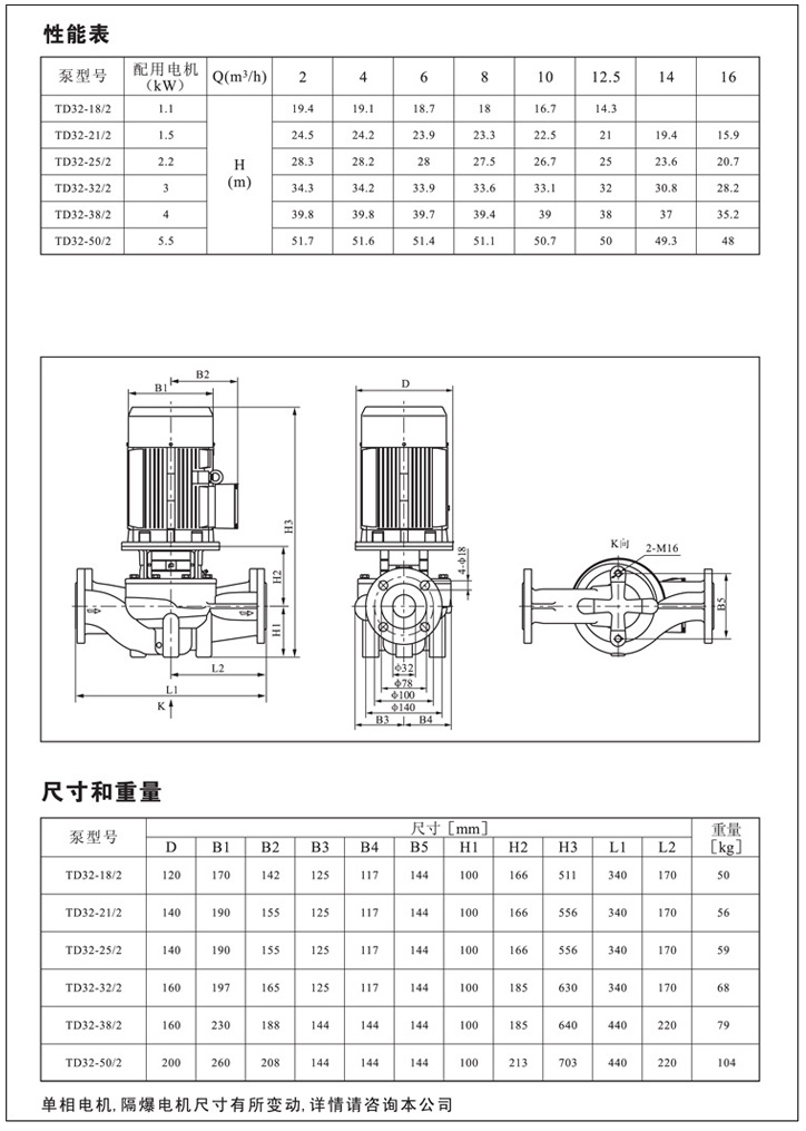 產(chǎn)品介紹 概述 TD32-18/2-1.1KW 鍋爐混流泵,配有標(biāo)準(zhǔn)電機(jī)和機(jī)械密封。此類產(chǎn)品的結(jié)構(gòu)與相近類型產(chǎn)品相比,更不易受到泵送液體中雜質(zhì)的影響。 產(chǎn)品設(shè)計(jì)為頂部可拉出的拆裝形式,其可以在不影響管路系統(tǒng)的情況下對(duì)泵進(jìn)行維護(hù)。 應(yīng)用 產(chǎn)品適宜在清潔、稀薄、非侵蝕、非易爆易燃,且不含有任何可能對(duì)泵造成機(jī)械或化學(xué)損害的固體顆粒和纖維的液體中使用。具體對(duì)液體要求及應(yīng)用如下;而在液體粘稠或密度較大情況下使用時(shí)會(huì)造成泵特性曲線的下降和能耗的增加。 液體溫度:-15℃~110℃ 系統(tǒng)最高壓力:常規(guī)型為PN12巴;特殊型為PN16巴。 TD產(chǎn)品在用于輸送水時(shí),其可以用于生活用水、工業(yè)用水、冷卻系統(tǒng)用水和區(qū)域供熱系統(tǒng)的冷、熱用水。TD產(chǎn)品可以在以下位置使用: 1) 主循環(huán)泵 2) 混合環(huán)路中的泵 3) 鍋爐混流泵 4) 燃?xì)饫鋬鰴C(jī)泵 5) 部分流量過(guò)濾器泵 6) 定壓系統(tǒng)用泵 7) 生活熱水循環(huán) TD產(chǎn)品用于工業(yè)方面。如在化工、制藥、食品加工等行業(yè)??梢杂糜冢?/div> 1) 原料的輸送 2) 系統(tǒng)增壓 3) 混合環(huán)路循環(huán)泵 安裝條件 產(chǎn)品有不同的安裝要求,具體的安裝要求如下: 1) 系統(tǒng)管路具有支撐泵的能力,2.2kw以下(包括2.2kw)電機(jī)的泵可以直接懸置于管道中 ;系統(tǒng)管路不具有支撐泵的能力或泵電機(jī)功率大于2.2kw時(shí),泵必須安裝在支架或底板上。 2) 對(duì)于配套2.2kw以下(包括2.2kw)電機(jī)的泵可以安裝在水平或垂直于管道的位置上;對(duì)于2.2kw以上電機(jī)的泵只能安裝在垂直于管道的位置上。 3) 泵的安裝,要保證泵在使用時(shí)系統(tǒng)管路的張力不應(yīng)傳遞到泵體上。 4) 為了保證電機(jī)的正常運(yùn)轉(zhuǎn),泵要安裝在保證有足夠冷卻的環(huán)境條件下,且冷卻空氣的溫度不能超過(guò)40℃。 5) 如果泵安裝在戶外,必須配置合適的外罩以防止電器元件進(jìn)水或凝霜。 6) 為了方便對(duì)泵的檢查和維修,在泵的上、下方必須留有足夠的空間。泵電機(jī)小于5.5kw時(shí)最小留300mm;泵電機(jī)大于5.5kw(包括5.5kw)時(shí)最小留1000mm。 7) 為了防止噪音和振動(dòng),保證獲得最佳運(yùn)行效果,泵在安裝時(shí)要采用減振底座。一般采用水泥底座,底座的重量應(yīng)該是大于或等于1.5×泵重量。 8) 為滿足客戶的不同需要,產(chǎn)品分為帶底板和不帶底板兩種。 ![]() ![]() 因產(chǎn)品生產(chǎn)批次、型號(hào)不同,產(chǎn)品圖片及安裝尺寸僅供參考,詳情可聯(lián)系我們的銷售人員了解更多TD32-18/2-1.1KW 鍋爐混流泵相關(guān)信息!
