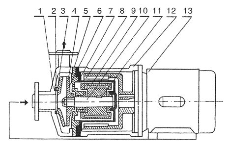 主要材料及用途 磁力泵結(jié)構(gòu)緊湊、外形美觀、體積小、噪音低、運(yùn)行可靠、使用維修方便??蓮V泛應(yīng)用于化工、制藥、石油、電鍍、食品、電影照相洗印、科研機(jī)構(gòu)、國防工業(yè)等單位抽送酸、堿液、油類,稀有貴重液、毒液、揮發(fā)性液體,以及循環(huán)水設(shè)備配套、過濾機(jī)配套。特別是易漏、易燃、易爆液體的抽送,選用此泵則更為理想。 磁力泵材質(zhì)種類 1)工程塑料泵(增強(qiáng)聚丙烯)型號有:8CQ—2、10CQ—3、14CQ—5、16CQ—8、20CQ—12、32CQ—15、40CQ—20、50CQ—25、50CQ—32、65CQ—32。 磁力泵結(jié)構(gòu)示意圖