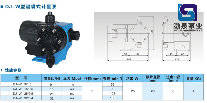 產(chǎn)品介紹 DJW25/0.5隔膜式計(jì)量泵產(chǎn)品介紹: 1. 流量范圍:0-32L/H 2. 壓力范圍: 0-1.0MPA 3. 電機(jī)功率: 60W,220V / 380V , 50/60Hz 4. 驅(qū)動(dòng)系統(tǒng):兩相、三相標(biāo)準(zhǔn)電機(jī)或防爆電機(jī), 5. 防護(hù)等級(jí): IP55 DJ-W 9/1.0隔膜式計(jì)量泵材料 1. 泵頭: 不銹鋼304、316, PVC, PTFE 2. 隔膜: PTFE 3. 單向閥: 不銹鋼304、316, PVC, PTFE 4. 閥球: ZrO2, SUS304, SUS316,陶瓷 DJ-W 9/1.0隔膜式計(jì)量泵工作條件 環(huán)境溫度: -30℃--- 60℃ ![]() 二、DJ-W型隔膜式計(jì)量泵產(chǎn)品特點(diǎn): 1. 操作安全,機(jī)械驅(qū)動(dòng)隔膜。 2. 密封性好,無(wú)泄漏,裝配維修簡(jiǎn)單安全。 3. 它可以傳輸高粘度介質(zhì),腐蝕性液體和危險(xiǎn)性的化學(xué)品。 4. 流量調(diào)節(jié)能夠調(diào)節(jié)沖程長(zhǎng)度或電機(jī)頻率。 5. 隔膜為多層復(fù)合結(jié)構(gòu)壓制而成,第一層超韌性Teflon耐酸薄膜,第二層EPDM彈性橡膠,第三層3.0mmSUS304支撐鐵芯,第四層采用強(qiáng)化尼龍纖維補(bǔ),第五層采用EPDM彈性橡膠完全包履,可有效提出升隔膜適用壽命。 廣泛應(yīng)用于石油化工、化工、電力、冶金、采礦、造船、輕工、農(nóng)業(yè)、國(guó)防等工業(yè)。 三、DJ-W型隔膜式計(jì)量泵原理: 本系列產(chǎn)品原理特性是由電機(jī)通過(guò)渦輪蝸桿驅(qū)動(dòng)的機(jī)械隔膜式計(jì)量泵,適用于低壓場(chǎng)合的流體計(jì)量。 隔膜式計(jì)量泵利用柔性隔膜取代活塞,在驅(qū)動(dòng)機(jī)構(gòu)的帶動(dòng)下使隔膜作來(lái)回往復(fù)運(yùn)動(dòng),改變泵腔容積,在泵進(jìn)出口閥的作用下吸排液體。 隔膜式計(jì)量泵可按各種工藝流程的需要,流量可在0-100%范圍內(nèi)無(wú)級(jí)調(diào)節(jié),定量輸送不含固體顆粒的腐蝕性和非腐蝕行性液體,泵頭配有多種過(guò)流材料(PPH、PTFE、PVC、PVDF、RPP、SS304、316、316L)。 隔膜計(jì)量泵由于能用隔膜把過(guò)流液體與驅(qū)動(dòng)潤(rùn)滑機(jī)構(gòu)之間的完全隔離,采用高科技的結(jié)構(gòu)設(shè)計(jì),并使用最新型的PTFE與橡膠復(fù)合膜片,耐腐蝕強(qiáng),大大的提高了膜片的使用壽命。 因產(chǎn)品生產(chǎn)批次、型號(hào)不同,產(chǎn)品圖片及安裝尺寸僅供參考,詳情可聯(lián)系我們的銷(xiāo)售人員了解更多DJW25/0.5隔膜式計(jì)量泵相關(guān)信息!