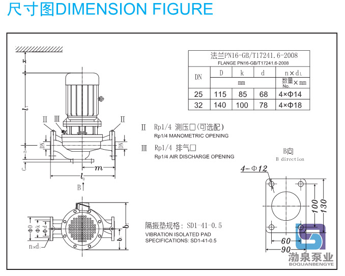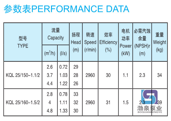 產(chǎn)品介紹 KQL25/150-1.1/2 立式管道離心泵供輸送不含固體顆粒的清水及物理化學(xué)性質(zhì)類似于水的液體之用。同時根據(jù)使用溫度、介質(zhì)等不同在ISG型管道離心泵基礎(chǔ)上派出適用熱水、高溫、腐蝕性化工泵、油泵。該產(chǎn)品具有同效節(jié)能、噪音低、性能穩(wěn)定等特點(diǎn)。 用途: KQL25/150-1.1/2 立式管道離心泵用于空調(diào)、采暖、衛(wèi)生用水、水處理冷卻冷凍系統(tǒng)、液體循環(huán)和供水、增壓及灌溉等領(lǐng)域中無腐蝕的冷水和熱水輸送。 工作條件: 轉(zhuǎn)速:2960r/min,1480r/min或980r/min 流量范圍:1.8~2000m3/h 揚(yáng)程:≤127m 介質(zhì)溫度:-10℃~120℃ 環(huán)境溫度:最大+40℃;海拔高度小于1000m;相對濕度不超過95% 材質(zhì): 泵殼、泵蓋、葉輪:鑄鐵 泵軸:45#鋼鍍鉻或不銹鋼(2Cr13) 機(jī)械密封動、靜環(huán):浸銻石墨、碳化硅 結(jié)構(gòu):結(jié)構(gòu)緊湊的單級泵,適用于現(xiàn)代建筑物。 產(chǎn)品特點(diǎn): KQL25/150-1.1/2 立式管道離心泵結(jié)構(gòu)緊湊、合理,泵與電機(jī)直接連接,外形美觀,占地面積小效率高,閉式鑄鐵葉輪,葉輪懸臂短,機(jī)泵軸完全同心,泵運(yùn)行平穩(wěn)、可靠,噪音低壽命長,強(qiáng)制環(huán)流沖洗機(jī)械密封,免保養(yǎng)、無滲漏。 管道泵選型指南: 例如:KQL80/160-7.5/2 或KQW80/160-7.5 KQL標(biāo)準(zhǔn)立式單級離心泵,KQW標(biāo)準(zhǔn)臥式單級離心泵 80進(jìn)出口直徑 160葉輪名義直徑 7.5/2電機(jī)功率/電機(jī)極數(shù) ![]() ![]() 因產(chǎn)品生產(chǎn)批次、型號不同,產(chǎn)品圖片及安裝尺寸僅供參考,詳情可聯(lián)系我們的銷售人員了解更多KQL25/150-1.1/2 立式管道離心泵相關(guān)信息!