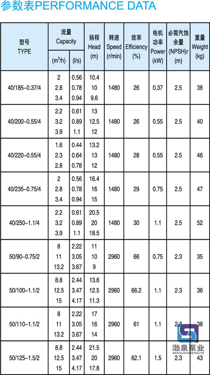 產(chǎn)品介紹 KQL50/100-1.1/2 立式管道循環(huán)泵供輸送不含固體顆粒的清水及物理化學性質(zhì)類似于水的液體之用。同時根據(jù)使用溫度、介質(zhì)等不同在ISG型管道離心泵基礎上派出適用熱水、高溫、腐蝕性化工泵、油泵。該產(chǎn)品具有同效節(jié)能、噪音低、性能穩(wěn)定等特點。 用途: KQL50/100-1.1/2 立式管道循環(huán)泵用于空調(diào)、采暖、衛(wèi)生用水、水處理冷卻冷凍系統(tǒng)、液體循環(huán)和供水、增壓及灌溉等領域中無腐蝕的冷水和熱水輸送。 工作條件: 轉(zhuǎn)速:2960r/min,1480r/min或980r/min 流量范圍:1.8~2000m3/h 揚程:≤127m 介質(zhì)溫度:-10℃~120℃ 環(huán)境溫度:最大+40℃;海拔高度小于1000m;相對濕度不超過95% 材質(zhì): 泵殼、泵蓋、葉輪:鑄鐵 泵軸:45#鋼鍍鉻或不銹鋼(2Cr13) 機械密封動、靜環(huán):浸銻石墨、碳化硅 結(jié)構(gòu):結(jié)構(gòu)緊湊的單級泵,適用于現(xiàn)代建筑物的。 產(chǎn)品特點: KQL50/100-1.1/2 立式管道循環(huán)泵結(jié)構(gòu)緊湊、合理,泵與電機直接連接,外形美觀,占地面積小效率高,閉式鑄鐵葉輪,葉輪懸臂短,機泵軸完全同心,泵運行平穩(wěn)、可靠,噪音低壽命長,強制環(huán)流沖洗機械密封,免保養(yǎng)、無滲漏。 管道泵選型指南: 例如:KQL80/160-7.5/2 或KQW80/160-7.5 KQL標準立式單級離心泵,KQW標準臥式單級離心泵 80進出口直徑 160葉輪名義直徑 7.5/2電機功率/電機極數(shù) ![]() ![]() 因產(chǎn)品生產(chǎn)批次、型號不同,產(chǎn)品圖片及安裝尺寸僅供參考,詳情可聯(lián)系我們的銷售人員了解更多KQL50/100-1.1/2 立式管道循環(huán)泵相關信息!