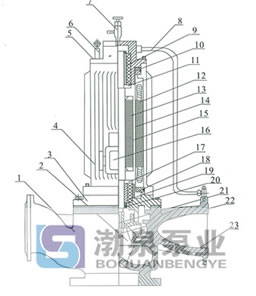 結構見圖。該泵為機泵一體結構,整機主要由泵體、葉輪、聯(lián)接體、滑動軸承、定子、轉子、屏蔽套、電機殼等零部件組成。泵為立式單級單吸離心式,進出口在同一水平軸線上,口徑規(guī)格相同可直接象閥門一樣安裝在管路的任何部位上,裝卸極為方便,占地面積省。泵通過聯(lián)接體與電機或一體,軸承采用進口石墨浸漬樹脂復合軸承,電子定轉子各有屏蔽套進行隔離。軸承采用流體本身介質作為潤滑劑及冷卻液,具有設計合理、運行可靠的特點。泵設有底座,可直接安裝在地基上,因該泵具有低噪音,無振動特點,安裝時無需加裝隔振器或隔振墊。