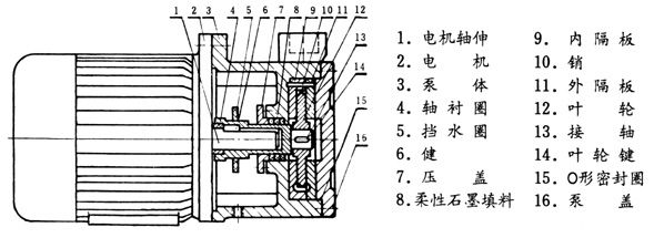 本泵采用泵與電機(jī)直聯(lián)結(jié)構(gòu),其進(jìn)水口為水平方向,吐出口垂直向上。 從泵端看,泵為逆時(shí)針轉(zhuǎn)動(dòng)。 葉輪可在懸臂軸上自由滑動(dòng),運(yùn)轉(zhuǎn)時(shí)能自動(dòng)調(diào)正葉輪二面的間隙,外隔板可借助于葉輪上的二螺孔與葉輪一起拆出