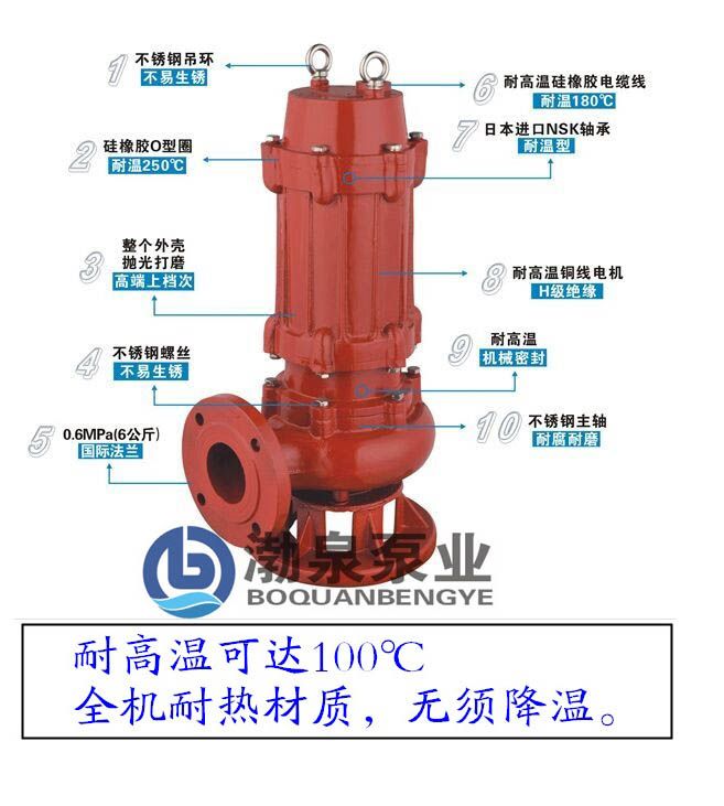 200WQR250-11-15熱水介質排污泵是一種耐溫達高100℃材質為鑄鐵的一款耐高溫排污泵,此款產品具有抽送介質溫度高、安裝移動方便、高效節(jié)能、防纏繞、無堵塞等特點??捎糜谳斔秃畚?、固體顆粒、纖維的高溫液體介質。眾所周知目前市面上的排污泵只能輸送介質溫度為常溫或40℃以內的介質,這款WQR耐高溫排污泵就很好解決了一些用戶介質溫度在40-100℃度之間不能使用潛水排污泵只能改過其它類型水泵的問題。 200WQR250-11-15熱水介質排污泵產品配置: 1、 采用耐高溫電機(H級絕緣);高溫銅線、H級絕緣材料和耐高溫絕緣漆。 2、采用耐高溫電纜、密封圈、機械密封和NSK日本進口高溫軸承。耐溫可達100度! 3、帶攪勻裝置, 有攪拌功能, 這個攪勻裝置在進出口下面, 隨著電機轉動, 攪勻裝置也跟著轉動,起到攪拌左右,能把水底的淤泥攪勻,再隨水一起排出。