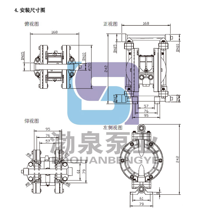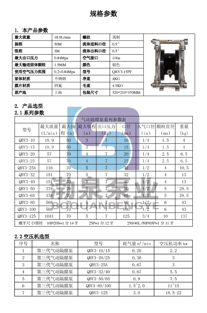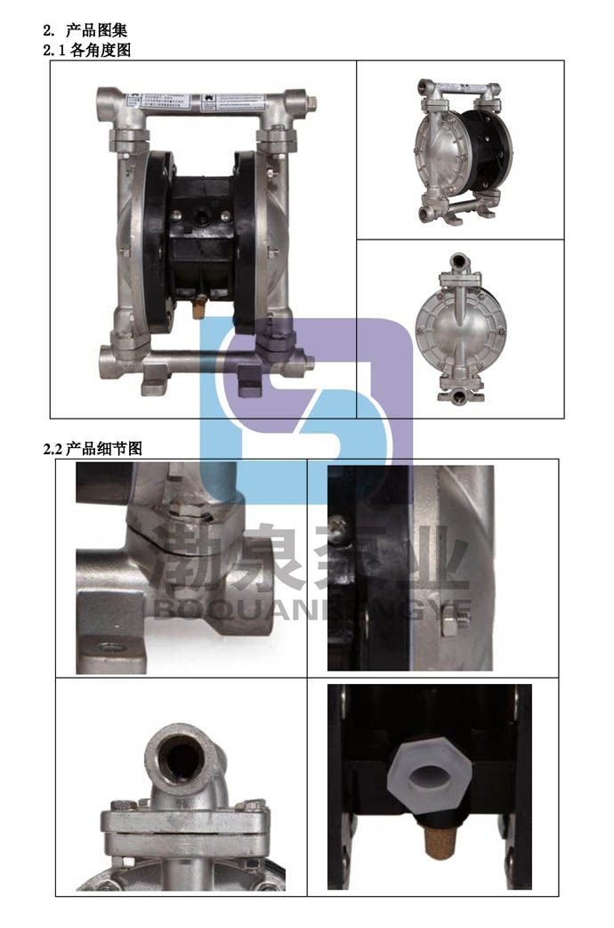 1.產(chǎn)品概述: QBY3系列第三代氣動(dòng)隔膜泵,采用壓縮空氣為動(dòng)力源,是一種由膜片往復(fù)變形造成容積變化的容積泵。不銹鋼氣動(dòng)隔膜泵具有質(zhì)量可靠、使用壽命長、噪音底、震動(dòng)小、永不死機(jī)、做工精細(xì)等六大優(yōu)點(diǎn),既能抽送流動(dòng)的液體,又能輸送一些不易流動(dòng)的介質(zhì),具有自吸泵、潛水泵、屏蔽泵、泥漿泵和雜質(zhì)泵等輸送機(jī)械的許多優(yōu)點(diǎn)。 性能特點(diǎn): 1.不需灌引水,吸程高達(dá)5米,揚(yáng)程達(dá)70米,出口壓力≧7bar; 2.流動(dòng)寬敞,通過性能好,允許通過最大顆粒直徑達(dá)10毫米。抽送泥漿、雜質(zhì)時(shí),對泵磨損甚微; 3.揚(yáng)程、流量可通過氣閥開度實(shí)現(xiàn)無級調(diào)節(jié)(氣壓調(diào)節(jié)在1-7bar之間); 4.該泵無旋轉(zhuǎn)部件,沒有軸封,隔膜等抽送的介質(zhì)與泵的運(yùn)動(dòng)部件、工件介質(zhì)完全隔開,所輸送的介質(zhì)不會(huì)向外泄漏。所以抽送有毒、易揮發(fā)或腐蝕性介質(zhì)時(shí),不會(huì)造成環(huán)境污染和危害人身安全; 5.不必用電,在易燃、易爆場所使用安全可靠; 6.可以浸沒在介質(zhì)中工作; 7.使用方便、工作可靠、開停只需簡單地打開和關(guān)閉氣體閥門,即使由于意外情況而長時(shí)間無介質(zhì)運(yùn)行或突然停機(jī)泵也不會(huì)因此而損壞,一旦超負(fù)荷,泵會(huì)自動(dòng)地停機(jī),具有自我保護(hù)性能,當(dāng)負(fù)荷恢復(fù)正常后,又能自動(dòng)啟動(dòng)運(yùn)行; 8.結(jié)構(gòu)簡單、易損件少,該泵結(jié)構(gòu)簡單,安裝、維修方便,泵輸送的介質(zhì)不會(huì)接觸到配氣閥,聯(lián)桿等運(yùn)動(dòng)部件,不像其他類型的泵因轉(zhuǎn)子、活塞、齒輪、葉片等部件的磨損而使性能逐步下降; 9.可輸送較粘的液體(粘度在1萬厘泊以下); 10.本泵無須用油潤滑,即使空轉(zhuǎn),對泵也無任何影響,這是該泵一大特點(diǎn); 11.塑料法蘭壓力:PN0.6MPa(10bar),金屬法蘭壓力:PN1.0MPa(10bar)。 ![]() ![]() ![]() ![]() ![]()