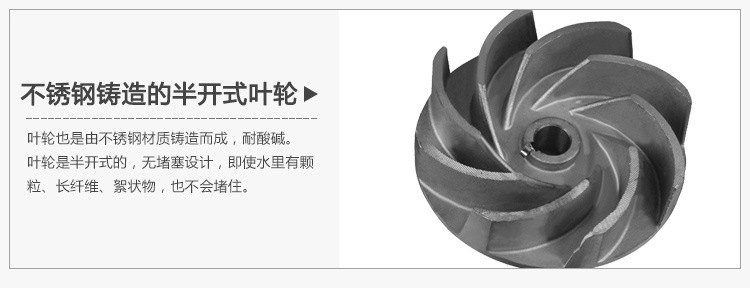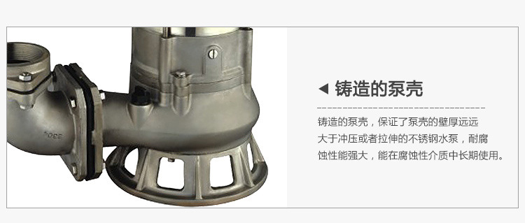 1、整體外殼采用不銹鋼SUS304 SUS316材質(zhì)精密鑄造制成,專(zhuān)門(mén)抽取有微酸弱堿的污水。