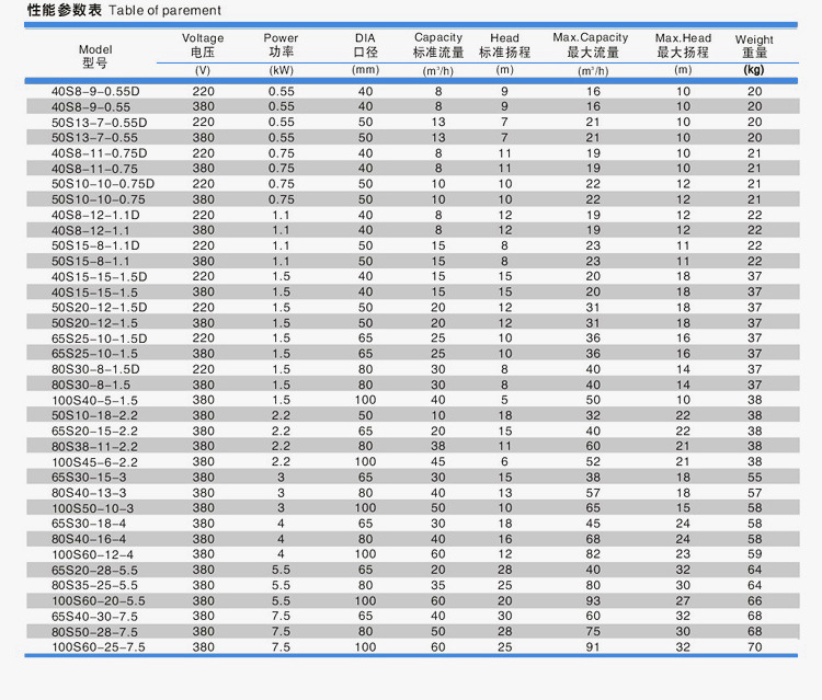 型號(hào) | 電壓 | 功率 | 出口 | 標(biāo)準(zhǔn)流量 | 標(biāo)準(zhǔn)揚(yáng)程 | 最大流量 | 最大揚(yáng)程 | 重量 |